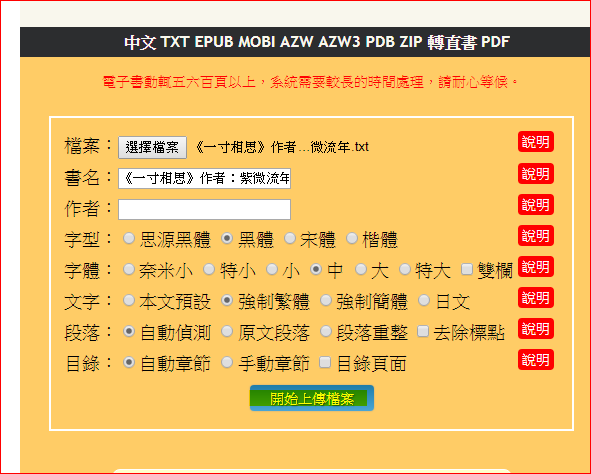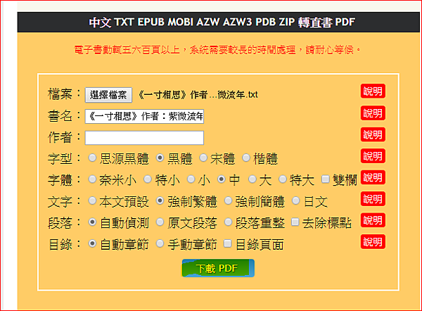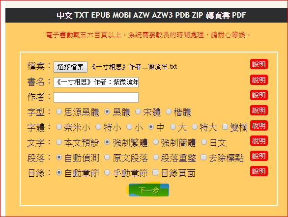 Step 3 上天火藏書網站http://ebook.cdict.info/ 點選下載的txt檔。再輸入書名,選喜歡的字型,並選擇強制繁體。之後按下一步。